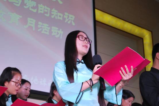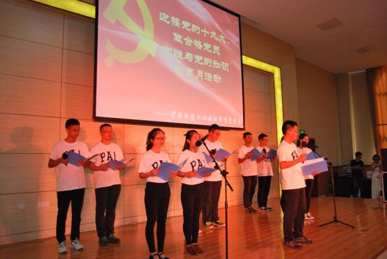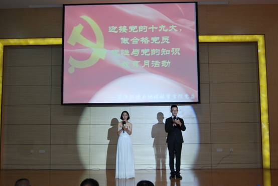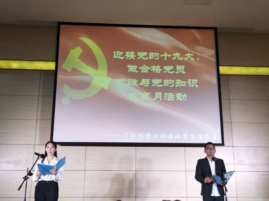 资源环境与地球科学学院于2017年9月22日在资环报告厅举行了主题为“迎接党的十九大·做合格党员”的党性与党的知识教育月诗词诵读比赛活动。出席本次活动的领导有院党委书记蔡光卉、院长谈树成、院党委副书记夏既胜。比赛评委由康国发、郭世昌、温一波、冯传奇和李祥等老师组成。各党支部的党员和积极分子们用诗词歌颂了中国共产党的苦难与辉煌的历史,朗诵出了对党的热爱和拥护。