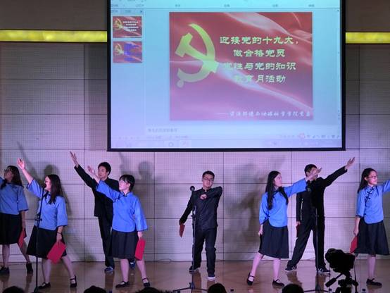 本科生第一党支部地质党小组穿着五四时期的服饰,女穿布衣,男穿中山,让我们重温那段光辉历史,以饱满的热情赞美党,赞美国家,赞美人民,一首诗歌《赞美党旗》让我们感受到中国共产党的伟大与神圣。